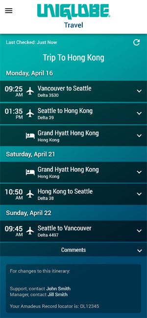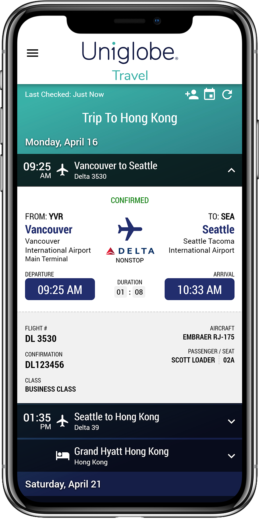 The Travel details you need most, with none of the unnecessary information. We’ve designed the display to make it easy for you access your complete itinerary.